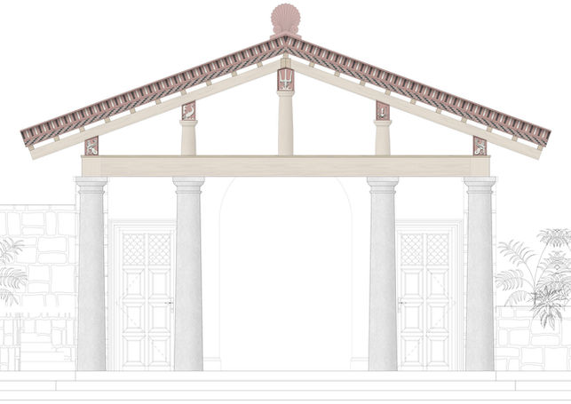 This little structure takes its inspiration from antiquity, playing with ideas to do with construction and decoration evoked by Vitruvius in his vision of ‘polite’ architecture developing out of vernacular principles, particularly roof construction(IV,1-2). However, instead of the ends of beams being fashioned like triglyphs on the supposition that these was derived from construction (as many have mis(?)-interpreted the ancient text to mean), we follow the cue of Etruscan architecture where the evidence of roof construction is more plentiful than for ancient Greece. In Etruria, in fact, many terracotta plaques have survived that once masked the ends of beams–and not one of them looks anything like a constructional feature, but rather display flora land mythological motifs, or even figural composition