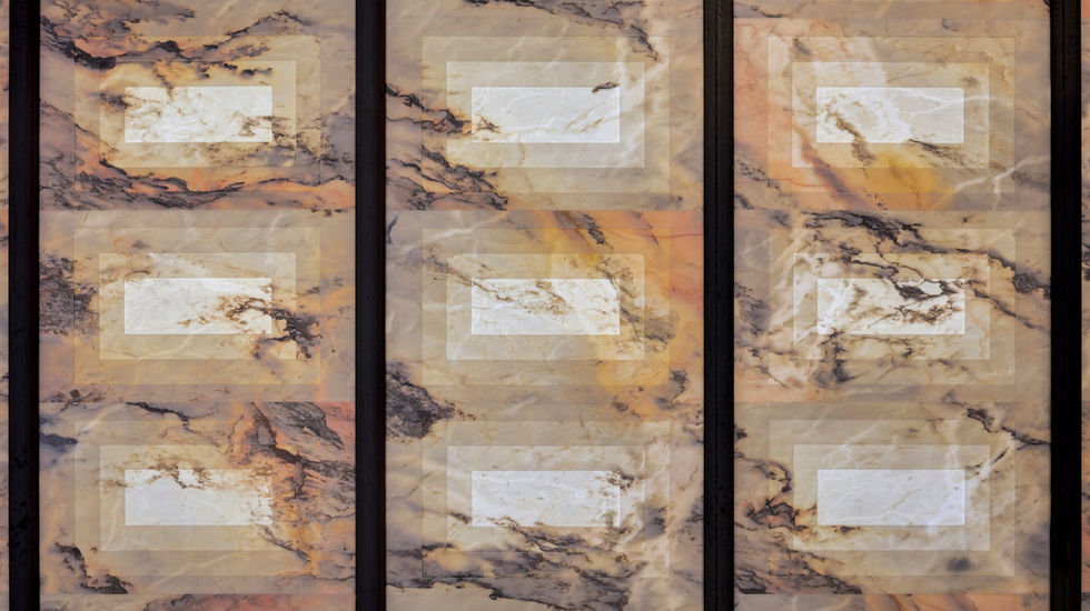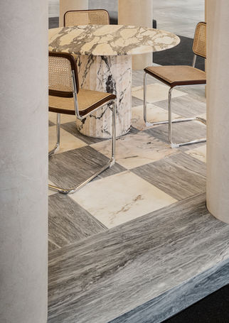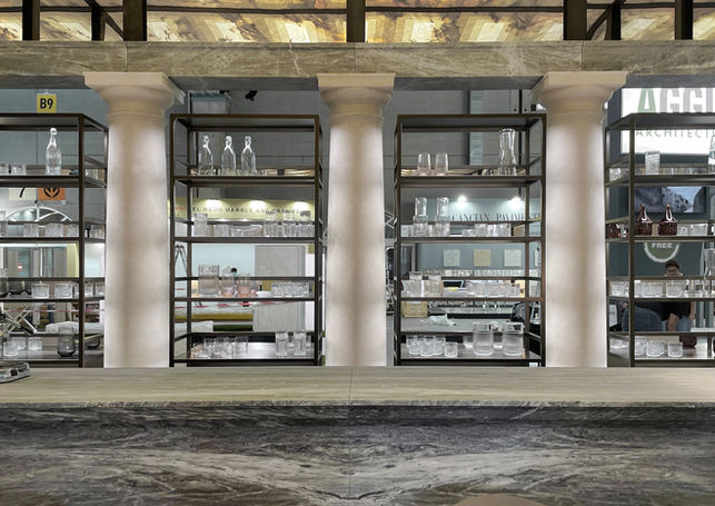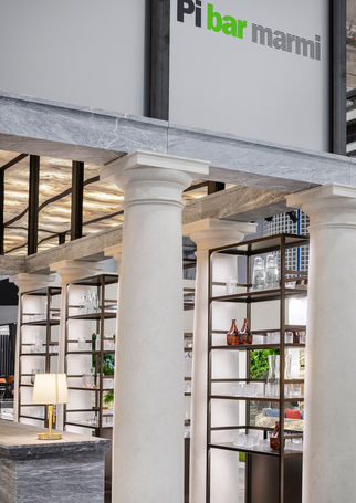 The Pibamarmi installation takes the Loosbar on the one hand, and Loos’s fondness for the Doric / Tuscan column on the other as starting points for an exploration of the ambiguities and contradictions inherent in his thinking, while reflecting on the status of marble in both the ancient and modern world while enjoying the aesthetic possibilities it gives rise to. In our version the coffering of the Loos bar, made of strips and assembled together, is transformed into monolithic slabs slimmed down for the sake of magical translucency.