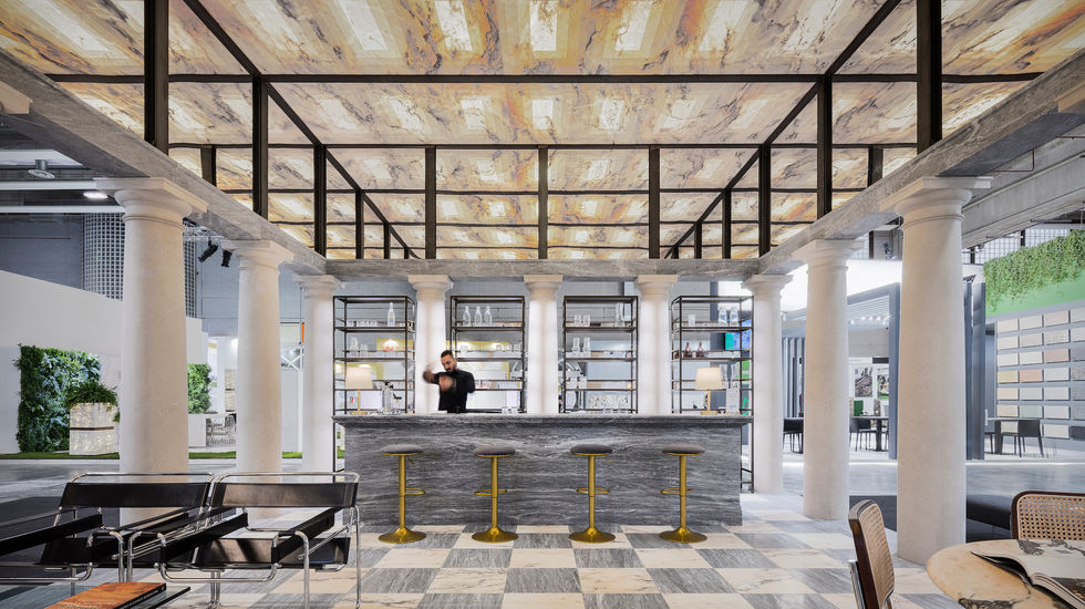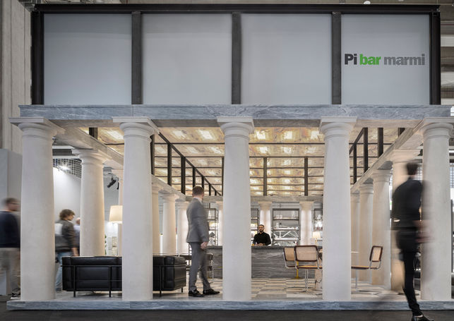 Every year the Marmomac fair takes place in the vast exhibition halls at Verona, this being the annual event for everyone working with stone in the construction sector. The surrounding region is home to many major stone companies, including Pibamarmi, who in previous years has commissioned installations for Marmomac from architects such as Grafton Architects, Alberto Campo Baeza and others of comparable renown. This year (2022) Pibamarmi invited Apollodorus Architecture to submit proposals, and the decision quickly fixed on the concept of revisiting the relationship between classical architecture, modern ornamentation (or the lack of it) and marble, via contradictory clues latent in the writings and projects of Adolf Loos, a figure obsessed by exactly these concerns.