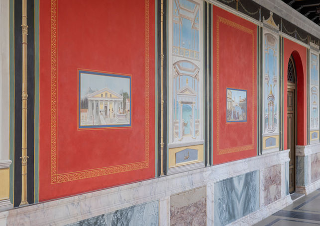 The ethos of our architectural practice is not to borrow directly but to proceed according to principles and experience, but when it comes to wall painting we hardly possessed the knowledge such a stance presumes, and we allowed ourselves to borrow liberally, adapting as necessary, especially in the area of figure composition. And so began a long process of research and immersion, with study visits to Herculaneum, Naples, Oplontis, Pompeii and Stabiae in Campania, to Rome for its museums and the Domus Aurea and to northern Greece where precursors can be found in a few surviving fragments of Hellenistic art and decoration. As the place where Roman painting has been recreated most extensively, and to a very high standard, the Pompeianum at Aschaffenburg in northern Bavaria, is also highly instructive. Invaluable comments, tips and feedback was also forthcoming from several of Mark’s academic friends specialising in ancient art, while the later stages of composition benefited from the expertise of Nikos Vakalis, fresco conservator, decorative artist and teacher, and his team that won the contract for execution.